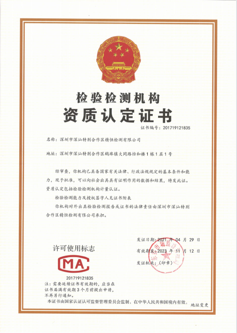 深圳市深汕特别合作区精恒检测有限公司前身为深汕特别合作区精恒工程检验有限公司,由乐鱼网站web版控股投资,于二零一四年十二月在汕尾市住房和城乡建设局备案(证书号:JCJG-2015003),从事检验检测工作,二零一五年深汕特别合作区招商引资,为了更好的服务于深汕特别合作区,方便于建设管理者严把建设工程质量关。根据国家相关法律、法规要求,当地也必须有国家认可的检验检测机构,作为一个深圳市检测经验丰富的检测机构,经汕尾市政府、深汕特别合作区管理委员会等领导审批后,作为第二批进驻深汕特别合作区企业。由于建设发展的需要,本公司于二零二一年十月二十七日更名为深圳市深汕特别合作区精恒检测有限公司。